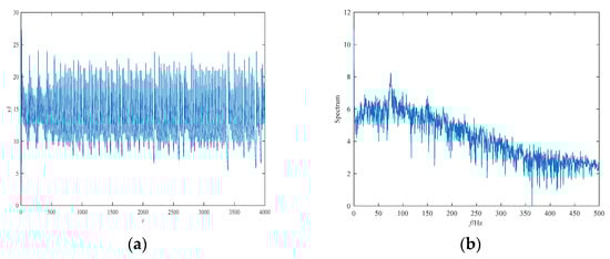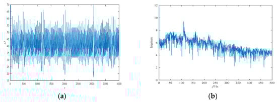 The time series of state variable and its frequency spectrum for system (6): (a) the time series; and (b) the frequency spectrum.