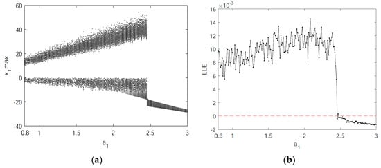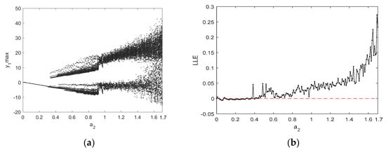 The bifurcation diagram and LLEs of the system (5) for with and : (a) the bifurcation diagram; and (b) the LLE graph.
