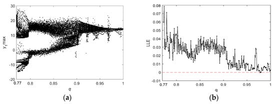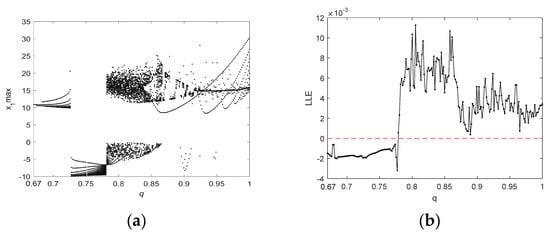 For , the bifurcation diagram and the Largest Lyapunov exponents (LLE) of system (6) as a function of parameter are shown in Figure 9. Similarly, Figure 10 illustrates the dynamic chaotic behavior process in terms of a bifurcation diagram and an LLE graph when and as q increases from 0.77 to 1. Figure 9 indicates that, when , there are negative, zero, and small positive LLE values, and the system is in a periodic state or a weak chaotic state with low complexity. As the value of increases from 0.8, the LLE is positive, so system (6) has chaotic behavior. Figure 10a shows that the dynamic state of system (6) can be roughly divided into three phases. More specifically, in the range of , the system exhibits complex bifurcation behavior, and there are large fluctuations in the corresponding LLE. When , there is a positive LLE with small fluctuations and large values; hence, the system is in a chaotic state with high complexity. For the range of , there is extremely complex dynamic behavior, including nonchaotic states, chaotic states, and weak chaotic states.