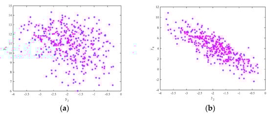 where , , , , , , , and are state variables, is the fractional order of the two systems (Equation (5) and Equation (6)), and and are parameters of the two systems. When and , the equilibrium of the system (5) is , where is an arbitrary real number, and the equilibrium of the system (6) is . So, the system (5) has countless equilibria, and the system (6) has only one equilibrium. The four eigenvalues of the Jacobian matrix at the equilibrium are , , , and . It is clear that equilibrium is an unstable saddle-focus point. If both systems are dissipative autonomous systems, then the parameters must satisfy and .