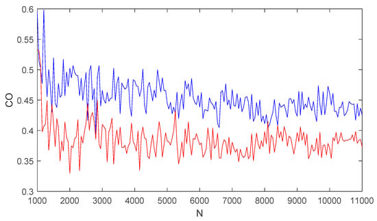 For system (5) and system (6), the prediction–correction method [] was used to solve the equation. For , a simulation step size , a fractional order , and the initial conditions , the complexity of the two systems with respect to the number of simulation points N is shown in Figure 11, where the blue curve corresponds to the of system (5) and the red graph corresponds to the of system (6). When , Figure 11 shows that there are gentle fluctuations: the complexity of the two systems (5) and (6) fluctuates slightly around the two lines of and , respectively. It is worth pointing out that as N increases the ripples become smaller, which indicates that the complexity of the system tends to be balanced for a large N value. Figure 11 also reflects that the value of for system (5) is larger than that of system (6); that is, system (5) is more complicated than system (6).