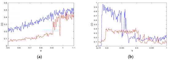 There are three variables in systems (5) and (6): , , and . For a simulation step size and , Figure 12 presents how the three variables affect the value of . When fixing , and varying the value of parameters and (where the coordinate variable denotes and , and ), the blue curve represents the of for system (5) and the red graph represents the of for system (6), as shown in Figure 12a. The two curves indicate that the value of rises as increases, and the complexity of the system (5) is greater than the complexity of the system (6), which is consistent with the results discussed in Section 3.2. Figure 12b shows the complexity as a function of , where and . As described in Section 2.3, there is chaotic behavior in both systems when . The complexity has high values in this region as shown in Figure 12b, which means that the algorithm can better reflect the degree of dynamic behavior and the complexity in fractional-order chaotic systems. Moreover, Figure 12b also shows that the complexity of system (5) is greater than that of system (6), which is consistent with the previous results.