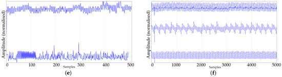 The main goal of this synthetic dataset was to test the effect of randomness on the rate of PE stabilisation. In principle, 100 random realisations of each case were created, and all the records contained 1000 samples to study the evolution for low m values. Most of them were also generated with 5000 data points to study the effect of greater m values, as described in Section 3. In the specific case of the logistic map, the resulting records were also used for classification tests since their chaotic behaviour can be parametrically controlled. This dataset, along with the key features and abbreviations, is described below. Examples of some synthetic records are shown in Figure 1.