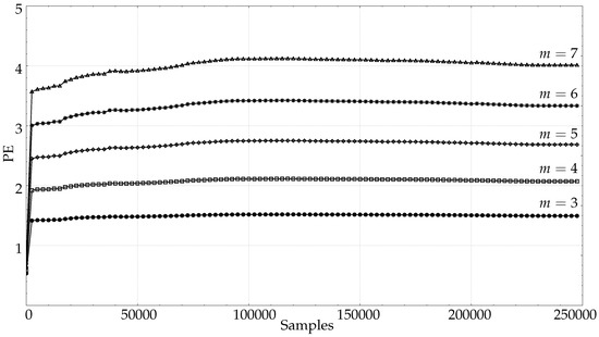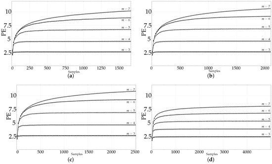 The other real signals yielded very similar results. The CLIMATOLOGY database stabilised PE at lengths shorter than 100 samples for , at 250 for , and at 750 samples approximately for . Using the SEISMIC records, the lengths were 50, 300, and 900 for . The FINANCIAL database needed 80, 450, and 850 samples for the same embedded dimensions. The EMG records of length 5000 became stable at 100, 400, and 950 respectively. All these signals were not long enough for and .