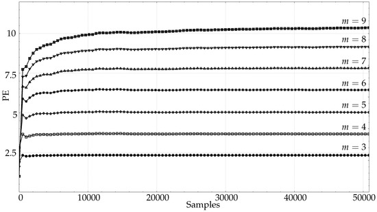 In absolute terms, PE values seem to reach a reasonable stability with 100 samples for , 500 samples for , and 1000 samples for . This can be arguably considered in agreement with the recommendation, but it is far more specific, and can be further relaxed if the records under analysis are more deterministic. In other words, they can be considered an upper limit. For greater m values, we very much doubt that stationarity could be assured for real–world signals and for the lengths required, and further studies are necessary.