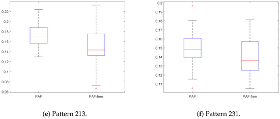 Boxplots of relative frequencies of ordinal patterns over time series with PAF and PAF–free.