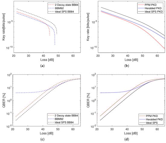 Table 1 shows a summary of the hardware types and corresponding QKD and PKD methods considered. Figure 1 shows a comparison of the quantum bit error rate (QBER) and bits per pulse achieved with these methods at increasing distances (losses). In this way the results can be presented independently of the pulse rate of any particular hardware setup. Although we use the term ‘pulse’ here for straightforwardness of comparison, the spontaneous parametric down conversion (SPDC) sources we consider are operated by a continuous-wave pump, i.e., not pulsed, and produce photon pairs on a stochastic basis, so ‘detection events’ would be the more appropriate term. Figure 1a,b show that for QKD protocols (BB84, BBM92) there is a sharp drop off in key rate as losses increase. At high losses more key has to be discarded in privacy amplification than is available so the secure key rate drops to zero. This does not happen in the PKD equivalents as it is assumed that there are no active man-in-the-middle attacks, and so privacy amplification is only required for multi-photon pulses.