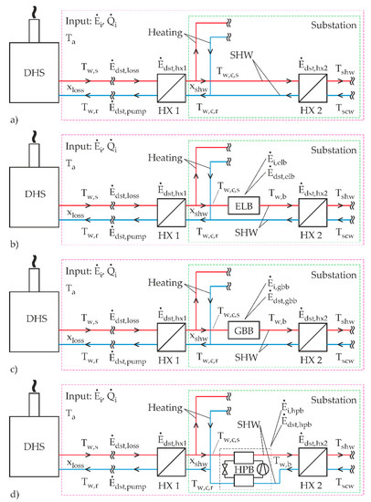 The presented study was performed for four different cases, as shown in Figure 1. The first one, denoted by (a), represents a district heating system (DHS) without a booster, where the supply temperatures (Tw,s and Tw,c,s) are high enough in order to sustain the required temperature of the sanitary hot water (SHW) (Tshw = 50 °C). In the second, third, and fourth cases, three different boosters, denoted by (b) electric-boiler-, (c) gas-boiler-, and (d) heat-pump-based, boost the temperature of the SHW to the desired temperature (Tw,b = 55 °C).