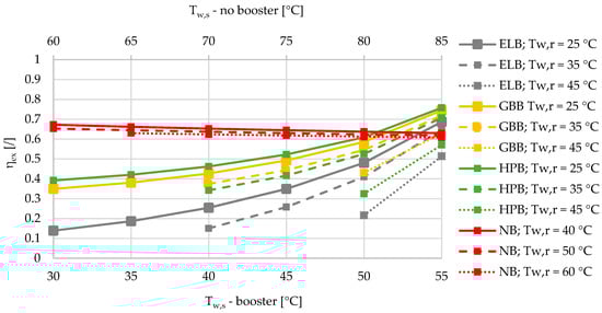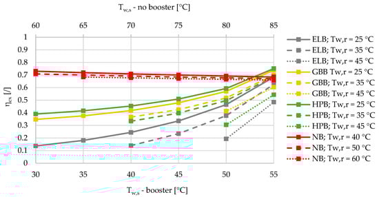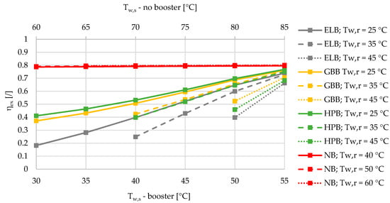 There is a very interesting additional observation regarding the exergy-efficiency values at the proposed return temperatures of the DHS with all three types of boosters. It seems that the optimal return temperature is 35 °C during the summer season, compared to 25 °C, which has a lower exergy efficiency above 40 °C (GBB), 45 °C (ELB), and 50 °C (HPB) for the supply temperature.