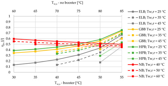 The mean ambient temperature in the heating season between October and April was calculated based on the TRY for Ljubljana (N 46 3′ 23′’, E 14 30′ 29′’) with the value of 6.0 °C. The heat losses of the DHS were fixed at 10%. Please note that in Figure 2, Figure 3, Figure 4, Figure 5, Figure 6, Figure 7 and Figure 8, there are two x axes for the sake of a comparison between all four different SHW production cases. The SHW production without a booster includes higher supply temperatures of a DHS compared to the SHW production with a booster.
