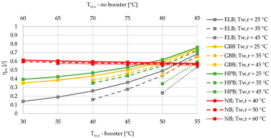 When using a booster during the SHW production, two additional terms must be taken into consideration: the rate of exergy destruction and the rate of exergy input of each particular booster. The rate of exergy destruction during temperature boosting of the hot water is calculated through the rate of entropy generation: