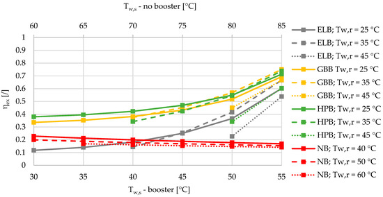 In order to perform an exergy-based analysis for different SHW productions, the exergy efficiency of each particular system for SHW production, either with or without a booster, was calculated using the following equation: