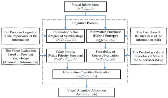 With the improvement in automation technology, humans have now become supervisors of the complicated control systems that monitor the informative human–machine interface. Analyzing the visual attention allocation behaviors of supervisors is essential for the design and evaluation of the interface. Supervisors tend to pay attention to visual sections with information with more fuzziness, which makes themselves have a higher mental entropy. Supervisors tend to focus on the important information in the interface. In this paper, the fuzziness tendency is described by the probability of correct evaluation of the visual sections using hybrid entropy. The importance tendency is defined by the proposed value priority function. The function is based on the definition of the amount of information using the membership degrees of the importance. By combining these two cognitive tendencies, the informative top-down visual attention allocation mechanism was revealed, and the supervisors’ visual attention allocation model was built. The Building Automatic System (BAS) was used to monitor the environmental equipment in a subway, which is a typical informative human–machine interface. An experiment using the BAS simulator was conducted to verify the model. The results showed that the supervisor’s attention behavior was in good agreement with the proposed model. The effectiveness and comparison with the current models were also discussed. The proposed attention allocation model is effective and reasonable, which is promising for use in behavior analysis, cognitive optimization, and industrial design.