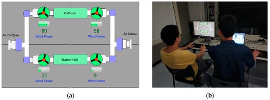 The experiment interface was a simulator running the BAS system showing the statuses of the main air exchange fans in the subway system (Figure 2a). The system information was shown on a 22-inch digital screen with a resolution ratio of 1680 × 1050. Based on capturing the reflected infrared lights with the eyes, the SMI RED500 (Silicon Microstructures Inc., California, CA, USA) tracked the participant’s eye movements with a 60Hz infrared-based camera. We used it to record the participant’s visual behaviors including the gaze points on the screen, the fixation distribution. The experiment environment is shown in Figure 2b.