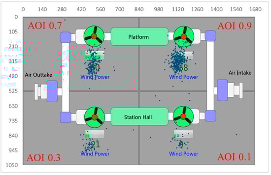 Through the information value, Vi, pre-given by the experts for the four sections, in one scene the section of the air intake fan in the station hall (intake@hall) had 0.1 membership degrees of information importance, the section of the air outtake fan in the station hall (outtake@hall) had 0.3; and the section of the air outtake fan in the platform (outtake@platform) had 0.7. The section of the air intake fan in the platform (intake@platform) had 0.9 membership degrees of information importance.