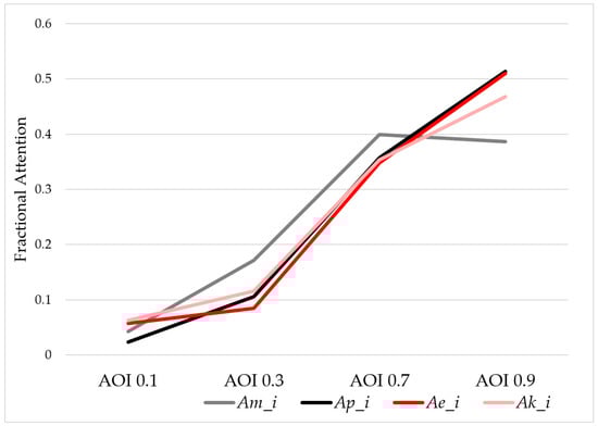 The fractional attention values of the key-press response experiment and the eye movement tracking experiment as well as the two theoretical values are shown in Figure 4.