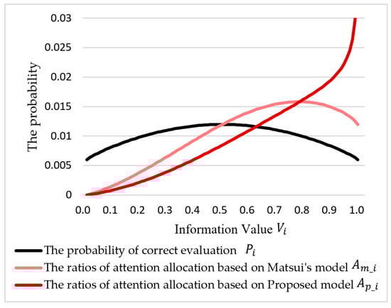 Along with the information value, Vi, the attention allocation based on Matsui’s Model, Am_i, and the proposed model, Ap_i, is shown in Figure 6. Based on Equation (17), we added the probability of the correct evaluation Pi into the figure. Pi is a factor of information fuzziness tendency, which affects the model.