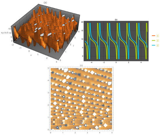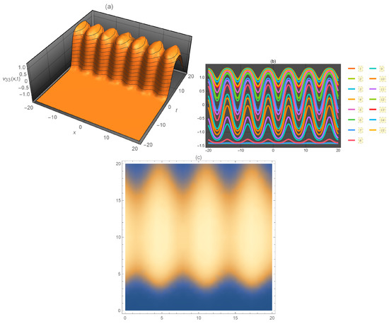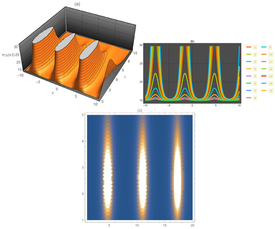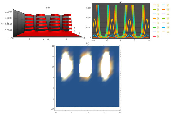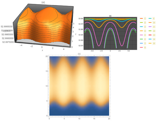 Representation of the solution of Equation (58): (a) three-dimensional ; (b) for several values of t and (c) density plot .