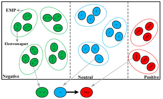 is shaped separately. The main process can be described as follows: three electromagnetic particles are randomly extracted from three electromagnetic regions (one EMP from each region), and then three electromagnets are randomly extracted from three electromagnetic particles obtained just now (one electromagnet from each EMP). Consequently, there are three electromagnets with different polarities. The neutral electromagnet is attracted and repelled by positive and negative electromagnets. Owing to the intensity of attraction is stronger than repulsion and the neutral electromagnet has a slight negative polarity, the neutral electromagnet moves a distance away from the negative electromagnet and approaches towards the positive electromagnet. In other words, each electromagnet in is a result of interaction between attraction and repulsion, which is shown in Figure 1.