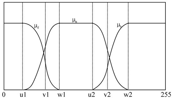 Fuzzy entropy thresholding can meet the requirement from single threshold segmentation to multiple thresholds segmentation, and the optimal threshold vector obtained is more precise. However, each threshold should be determined by three parameters in fuzzy entropy thresholding, and thresholds need to be defined by 3n fuzzy parameters [41,42].