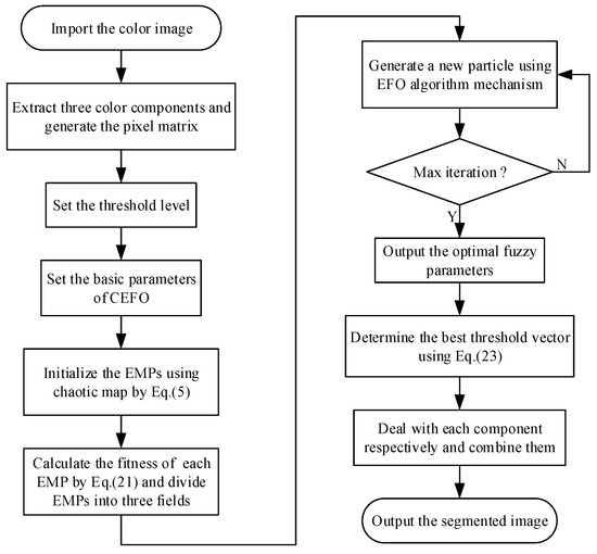 Flow chart of fuzzy entropy thresholding method based on the Chaotic Electromagnetic Field Optimization (CEFO) algorithm.