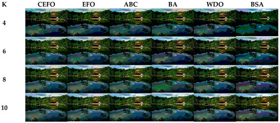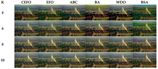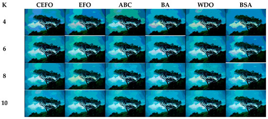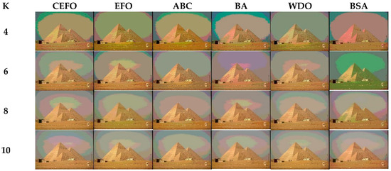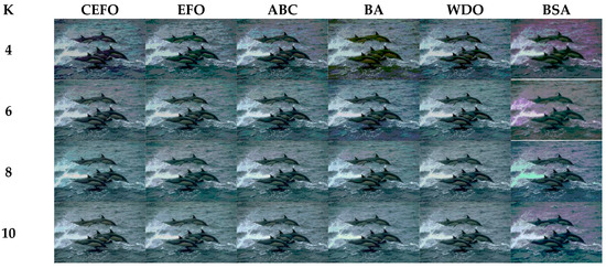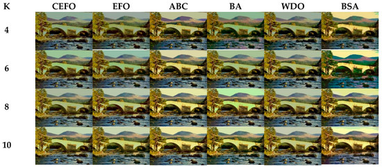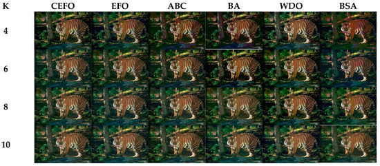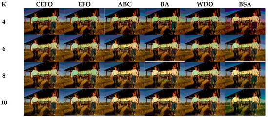 From what has been mentioned above, the CEFO algorithm has superior performance when searching for the optimal threshold vector in multilevel thresholding color image segmentation.