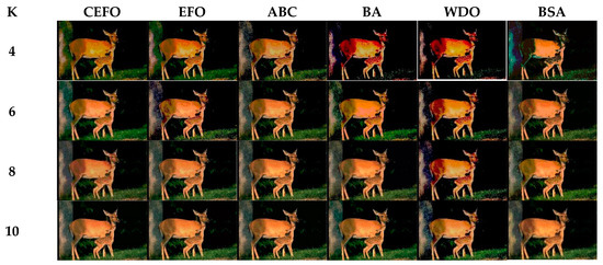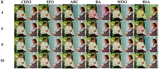 Comparing the results of MSSIM and FSIM in Table 7, FSIM is considered to be more authoritative and application and CEFO also performs better than other algorithms in this index. Although EFO can have a banner performance at K = 4, ABC will usually be close to EFO at high levels. BA has better values at some images such as in Test 2, 4, etc. WDO and BSA have higher values than BA at K = 6 in some images but they are all lower than CEFO on the whole.