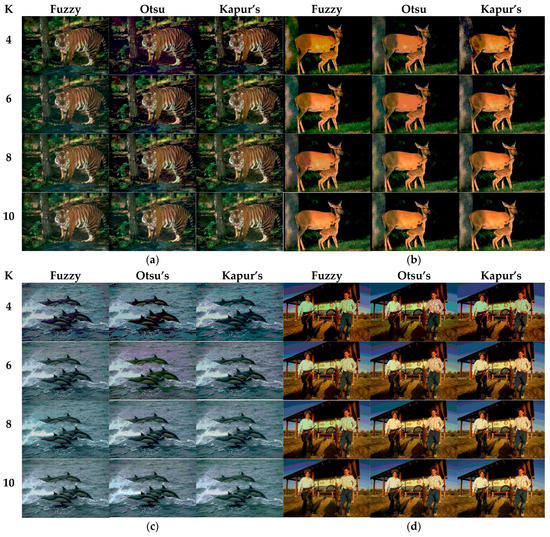 Segmented images at K = 4, 6, 8, 10 using CEFO algorithm based on fuzzy entropy, Otsu’s and Kapur’s entropy.