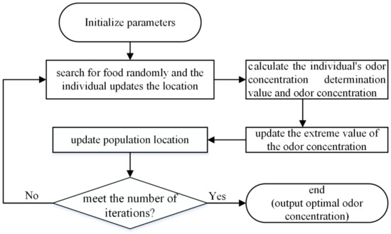 (1) Set parameters: Given the number of fruit flies , the maximum number of iterations , the dimension of optimization , and the initial position of the population , the initial position is obtained randomly.