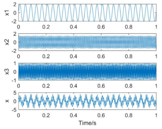 To illustrate the effect of k and α on the VMD results, a simulated signal, as shown in formula (19), is constructed: