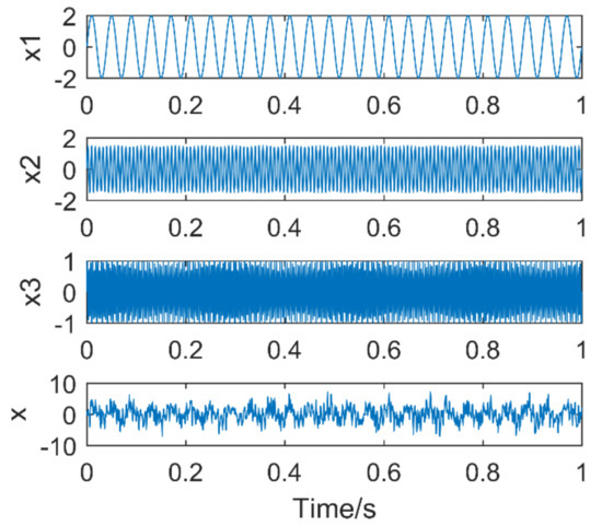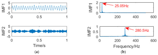 The simulation signal consists of three sinusoidal signals, = 25 Hz, = 130 Hz, = 280 Hz. The sampling points are 1024, and the sampling frequency is 1024 Hz. The time-domain diagram of the simulation signal is shown in Figure 4. Figure 5a,b are the time-domain and frequency-domain graphs of VMD when k = 2 and α = 2000, respectively. IMF1 corresponds to the simulation signal , IMF2 to the simulation signal , the corresponding frequency 130 Hz of the simulation signal is not extracted, it occurs the phenomenon of under-decomposition appears. When k = 3 and α = 1.8 × 106, the decomposition results of VMD are shown in Figure 6a,b. It can be seen that the signals with frequency of 130 Hz and 280 Hz are extracted, while the signals with frequency of 25 Hz are not extracted and are completely discarded. An inappropriate α will affect the accuracy of the decomposition.