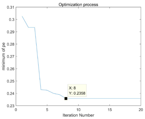 Firstly, set the parameters of the immune fruit fly optimization algorithm: the number of fruit flies is 30, the maximum number of iterations is 20, and the number of optimal dimensions is 2. In order to reduce the amount of calculation, the optimization range is set for the parameters k and α that need to be optimized. The optimization range of k is set to [2,8], and the optimization range of α is set to [100,5000]. The dimension of permutation entropy is empirical value 6, and the optimization process is shown in Figure 11. It can be seen that the best result of optimization is in the 8th generation, and the minimum permutation entropy value of iterative optimization is 0.2358. The corresponding combination of (k, α) is [3,527], which is input into the VMD, the time domain and frequency domain diagrams obtained after decomposition are shown in Figure 12a,b.