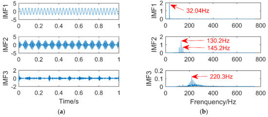 It can be seen from Figure 12b that the IMF1 corresponds to the frequency of the sinusoidal signal of 32 Hz, IMF2 extracts the frequency of the modulated signal 130 Hz, and the sidebands of 115 Hz and 145 Hz can be clearly found in this component. Although the frequency domain diagram of IMF3 is surrounded by noise, its highest peak corresponds to the frequency of the impulse signal of 220 Hz. The error is within the allowable range, so the VMD optimized by immune fruit fly optimization algorithm can accurately extract the information of each component in the composite signal.