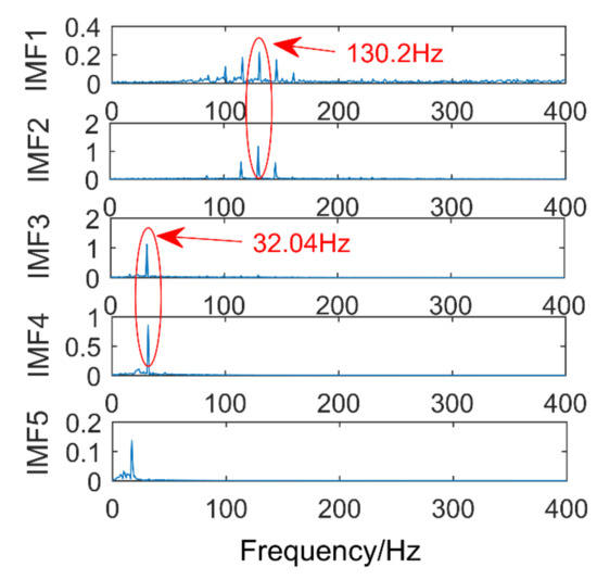 Time domain and frequency domain diagrams via EEMD are shown Figure 13a,b. Figure 14 is a partial enlarged view of Figure 13b. The amplitude of gaussian white noise added by EEMD is 0.2 and the number of times added is 50. The component with frequency of 130 Hz appears in IMF1 and IMF2, it occurs mode mixing. The frequencies of IMF3 and IMF4 are both 32 Hz, mode mixing also occurred. IMF5-IMF10 are pseudo-components and fail to find signal components related to 220 Hz in all IMFs. In conclusion, severe mode aliasing occurs in EEMD, and the shock signal cannot be extracted.