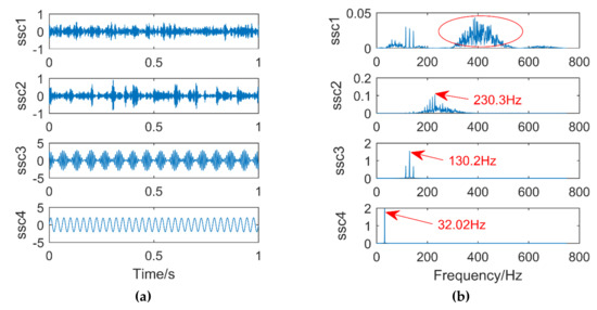 Figure 15a,b are time domain and frequency domain diagrams after singular spectral decomposition (SSD). It can be seen from the figure that the signal is decomposed into Singular spectral components (SSC) via SSD, and high-frequency noise appears in SSC1. the frequency of the peak of SSC2 in the frequency domain diagram is 230.3 Hz, which is very different from the frequency of the impulse signal of 220 Hz, its error is 10.3 Hz, in other words, the impulse signal information cannot be accurately extracted. SSC3 extracts the modulation signal with a frequency of 130 Hz, and at the same time, the side bands with frequencies of 115 Hz and 145 Hz can be clearly seen. The sinusoidal signal with a frequency of 32 Hz appears in the SSC4. In summary, high-frequency noise occurs in the decomposition result of the SSD and the impulse signal is not accurately extracted.