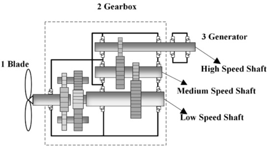 In order to verify the feasibility of the proposed method in engineering application, a company’s wind turbine gearbox was used for experimental verification. Its structural diagram is shown in Figure 16. It mainly includes 1 blade, 2 gearbox, and 3 generators. The gear box contains a planetary gear train, low speed shaft, medium speed shaft, high speed shaft, and so on.