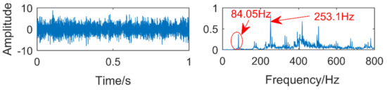 The time domain and frequency domain diagrams of the experimental signals are shown in Figure 19. The frequency indicated by the arrow in the frequency domain diagram is 253.1 Hz, which is very close to the triple frequency of the inner ring fault. The frequency circled by the red ellipse is 84.05 Hz, but its amplitude is lower than the corresponding amplitude of the frequency of 253.1 Hz, which is easy to cause misdiagnosis. In addition, the frequency of the ball fault cannot be found from the figure, indicating that the ball fault is weak and difficult to extract.