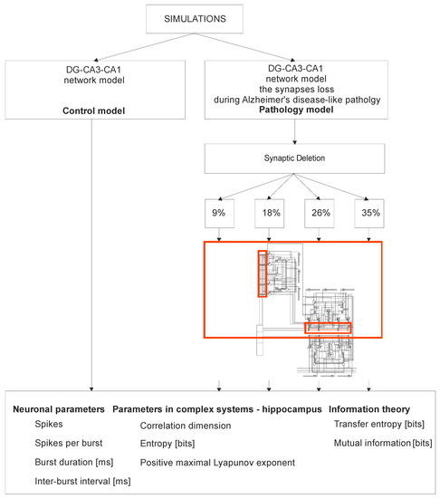 Five simulations were performed: one of them was characterized by a control model (control model), and another four a pathological model (pathological model). Figure 1 presents a detailed diagram of the simulation of the hippocampus network DG-CA3-CA1. The pathological model simulated synaptic breakdown in the hippocampus for four consecutive phases: 9%, 18%, 26% and 35% of the synapse loss modeling the dynamics of AD. Modeling of AD consisted in turning off one after the other connections with EC2 and connections with EC2 on inhibitory interneurons on the granule cells of the dentate gyrus and on CA3 pyramidal neurons (basket cells within the dentate gyrus (DG) and CA3) (broken connections are marked red on Figure 1). In our parallel simulation study, we performed a comparative analysis of neuronal parameters, the complexity of the hippocampus through a positive Lyapunov exponent, correlative dimension and Shannon entropy and parameters of information theory (entropy transfer and mutual information).