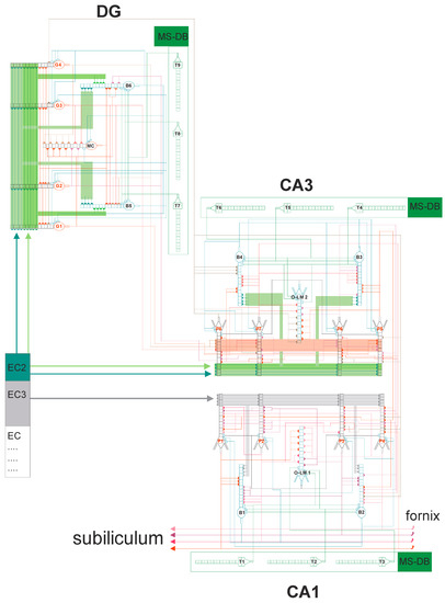 DG-CA3-CA1 hippocampal formation microcircuit. On the left is the dentate gyrus (DG) region, CA3 on the right and CA1 at bottom. Major cell types and their connectivity: granule (G1–G4), pyramidal (P1–P8), basket (B1–B6), OL-M (1–2) cells, mossy cell (MC). T1–T9 represent GABAergic cells in the medial septum-diagonal band (MS-DB) region which provides the disinhibitory inputs on hippocampal GABAergic interneurons at theta rhythm. All external and internal glutamatergic pathways innervate both principal cells (pyramidal and granule) and GABAergic interneurons (B and OL-M). The dentate gyrus and the CA3 area receive radially segregated layer II (EC2) inputs from both the medial (MEC) and lateral (LEC) entorhinal cortex. The combined and dentate-/CA3 processed MEC and LEC information is transmitted to CA1 pyramidal cells. Principal neurons in the entorhinal cortex layer 3 (EC3) directly project to the CA1 field and synapse with CA1 pyramidal neurons. The MEC and LEC are in reciprocal connections with different segments of the CA1 area and the subiculum, which however receive processed information from both MEC and LEC via the CA3 input.