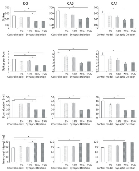 On the other hand, the statistical analysis of burst duration showed a statistically significant reduction of time in the synaptic breakdown model at the 26% and 35% levels compared with the control (19.6 and 19.9 vs. 41.6, P < 0.05) in DG. The time reduction was also obtained at the 26% breakdown level compared with the 18% level (19.6 vs. 36.0, P < 0.05) in DG (Figure 4). In the CA3 model, a statistically significant shortening of burst duration was obtained in the synaptic breakdown model at the 26% and 35% levels compared with the control (18.7 and 20 vs. 43.0, P < 0.05). In contrast, in the CA1 region, a significant shortening of burst duration was obtained in the synaptic breakdown model at the 26% and 35% levels compared with the control (17.5 and 18.2 vs. 41.2, P < 0.05) (Figure 4). Statistically significant negative correlations at the level of synaptic breakdown were obtained, and a burst duration for DG (correlation coefficient R = −0.80, P < 0.001), CA3 (correlation coefficient R = −0.85, P < 0.001) and CA1 (correlation coefficient R = −0.85, P < 0.001).