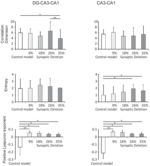 The nonlinear analysis of simulations at the DG-CA3-CA1 region (left) and CA3-CA1 (right). The comparison control model and model the synapses lost during an Alzheimer’s disease-like pathology: synaptic deletion 9%, 18%, 26% and 35% correlation dimension, entropy and positive Lyapunov exponent for the pyramidal cell comparison control model (* P < 0.05, ** P < 0.01, *** P < 0.001).
