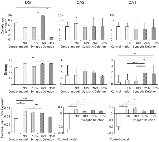 The nonlinear analysis of simulations at the DG, CA3 and CA1 regions. Comparison control model and model the synapses loss during an Alzheimer’s disease-like pathology: synaptic deletion 9%, 18%, 26% and 35% correlation dimension, entropy and positive Lyapunov exponent for the pyramidal cell comparison control model (* P < 0.05, ** P < 0.01, *** P < 0.001).