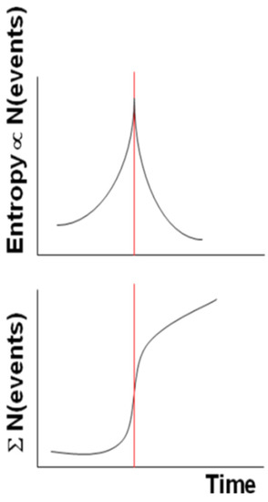 More generally, if we replace the increasing temperature with the system entropy, then the system reaches its critical point (vertical red line in Figure 1) at the largest entropy and approaches it with an accelerating power law in its cumulative of punctuated events (we intend here for an “event” as an anomalous behavior of the system evolution, e.g., when its signal level is larger than a certain number of standard deviation, σ, e.g., 2.5 σ).