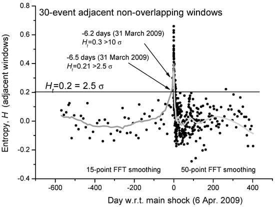 As mentioned in [58], Shannon entropy can be estimated in three different ways: cumulative, moving overlapping or distinctively temporal windows. For the first case study, i.e., the 2009 L’Aquila (Central Italy) seismic sequence, we will consider adjacent non-overlapping moving windows. In Figure 2 we show the estimation of the Shannon entropy based on non-overlapping windows of 30 M1.4+ seismic events occurred in a circular area of 80 km around the main-shock epicenter. The low number of events used for the analysis in each window was chosen to better follow even shorter fluctuations of entropy, especially for the foreshocks. It is interesting that two distinct entropy values before the main-shock occurrence are larger than the threshold Ht = 2.5 σ (the mean value of entropy, <H>, is practically zero). To better visualize the mean behavior of entropy, the gray curve defines a reasonable smoothing of the entropy values: 15-point FFT before the main-shock and 50-point FFT smoothing after the main-shock. The different kind of smoothing is related to the different rate of seismicity before and after the main-shock. It is interesting to notice that the smoothed gray curve of the Shannon entropy reproduces the expected behavior of a critical system around its critical point, with the main-shock as a critical point.