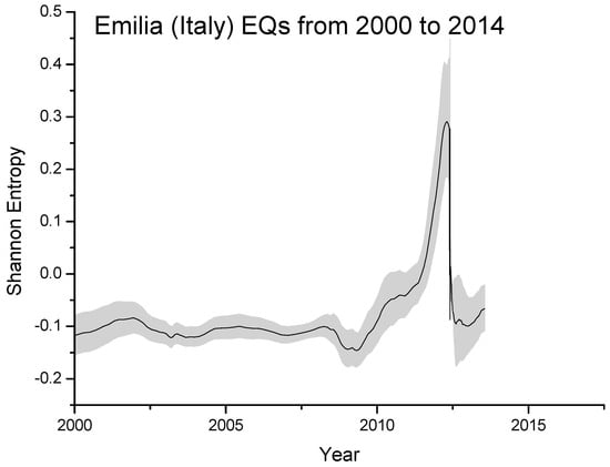 Shannon entropy for the Emilia seismic sequence from 2000 to 2014. The significant increase from around 2010, with the maximum at around the main-shock occurrence, is expected to be real. The gray area defines the statistically estimated (one standard deviation) error in computing the entropy.