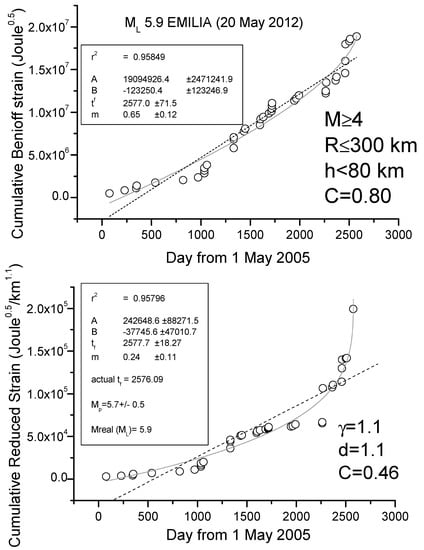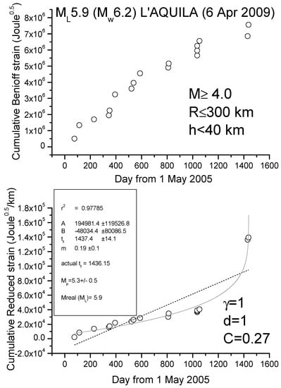 Extending the meaning of (10) to the strain accumulated over a larger area around the epicenter, [73] obtained interesting results with the so-called accelerating moment release (AMR) approach that consists in fitting the cumulative value s(t) expressed as in Equation (8), with a power law in the time to failure tf, i.e., the theoretic time of occurrence of the main shock: s(t) = A + B(tf − t)m, where A, B and m are appropriate empirical constants (m is expected between 0 and 1: typical value is 0.3; [37]). The fitting process gives as an outcome the time tf together with the expected magnitude, which is related to either A or B: