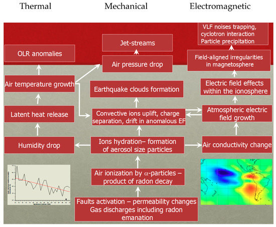- Pulinets, S.A.; Ouzounov, D.P.; Karelin, A.V.; Davidenko, D.V. Physical bases of the generation of short-term earthquake precursors: A complex model of ionization-induced geophysical processes in the Lithophere-Atmosphere-Ionosphere-Magnetosphere System. Geomagn. Aeron. 2015, 4, 522–539. [Google Scholar] [CrossRef]