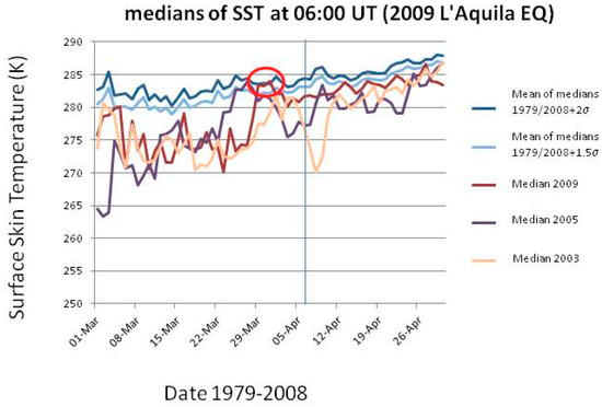 If the process of rupture that causes the EQ is still plenty of open issues and unanswered questions (e.g., [15]), even more difficult is the understanding of the process of EQ preparation, although some efforts have been performed (e.g., [16,17,18]). It is thought that it may be accompanied by some exchanges of mass and energy, which can change the energy budget in the earth-atmosphere system over the seismogenic zone. In fact, scientific literature reports a wide variety of phenomena preceding EQs which have been studied extensively with the aim of finding some recurrent and recognizable patterns: induced electric and magnetic fields, groundwater level changes, gas and infrared (IR) electromagnetic emissions, local temperature changes, surface deformations, ionospheric instabilities (see [19,20] for more exhaustive reviews).