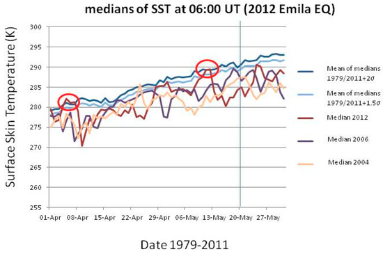 - Qin, K.; Wu, L.X.; De Santis, A.; Cianchini, G. Preliminary analysis of surface temperature anomalies that preceded the two major Emilia 2012 earthquakes (Italy). Ann. Geophys. 2012, 55, 823–828. [Google Scholar]