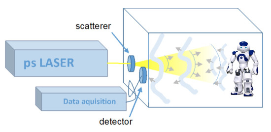 Recent advances in photonics offer various innovative approaches for three-dimensional imaging [42]. Among those is time-of-flight imaging, which enables detection and tracking of objects. This involves illuminating the scene with diverging light pulses shorter than 100 ps. The light is scattered back from the scene and its flight time is detected with respective accuracy. Flight time t of light multiplied by the speed c of light directly gives the distance the light pulse has travelled from the source to the detector. Often, the laser source and detector are nearby and the value equals twice the distance of the object. Compared to time-of-flight ranging used in LiDARs (Light Detection And Ranging device), the principles introduced here utilise the knowledge of light propagation and are potentially capable of achieving higher spatial resolution.